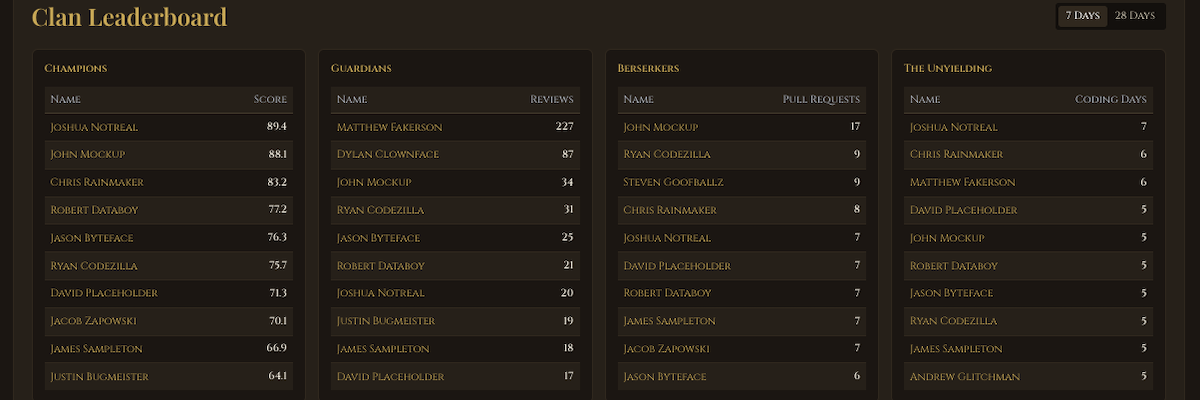 The Clan Leaderboard doesn't just rank by a single number. It breaks contributions into four categories: Champions (overall impact score), Guardians (code reviews), Berserkers (pull requests), and The Unyielding (coding days). This means different types of contributions are recognized — the quiet reviewer gets visibility alongside the prolific committer.